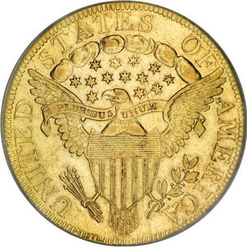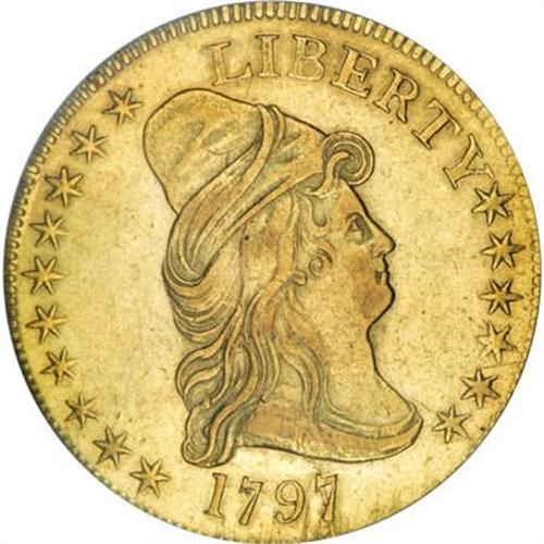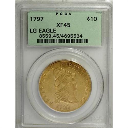 <B>1797 $10 Large Eagle XF45 PCGS.</B></I> Breen-6835, Taraszka-11, BD-3, R.5. The stars are arranged 10 x 6, the only obverse used with the Large Eagle reverse. The eagle has a short, thin neck. Stars 1, 7, 8, 9, and 10 are nearly in a straight line; stars 7 and 10 are lower. The arrowheads extend nearly to the right upright of the N in UNITED, but not beyond, as on the BD-2. This is a lovely, original coin with much mint luster remaining over the surfaces that display beautiful orange-gold coloration. There are no visible adjustment marks, and the few contact marks seen are undistracting and grade-consistent. A nice Choice XF piece, certified in a green-label holder.<BR><BR><B>Coin Engraver:</B> Robert Scot<BR><BR><b>Shipping:</b> Coins & Currency (<a target="_blank" href="http://www.heritageauctions.com/common/shipping.php">view shipping information</a>)