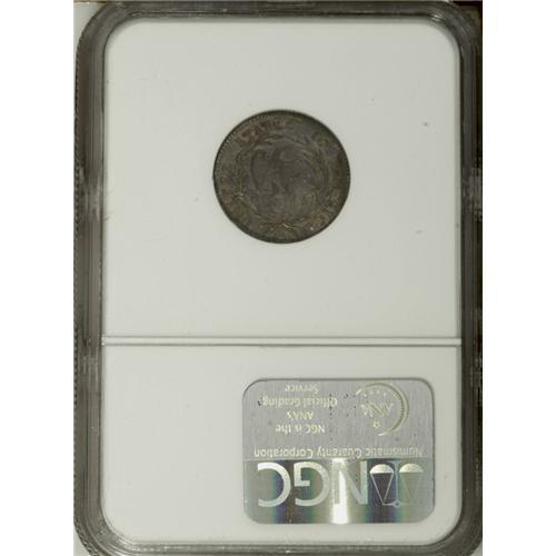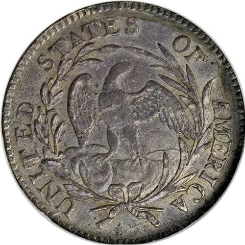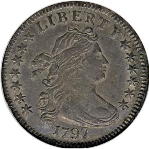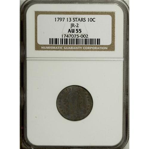 <B>1797 10C 13 Stars AU55 NGC.</B></I> JR-2, R.4. Scarcer than JR-1, the JR-2 variety is especially difficult to locate in grades above XF. This attractive example retains evidence of the original finish beneath rich copper-brown, forest-green, and lilac-gray toning. The boldly defined features are nicely centered within well defined borders. There is a large planchet lamination (as struck) on the eagle's breast, and several shallow adjustment marks are noted below Liberty's ear. Both sides are free of severe marks, but a few minor abrasions are located near the T in UNITED and along TAT in STATES, near the reverse border. The reported mintage of 25,261 half dimes may have included more than 10,000 coins dated 1796, according to several numismatic authorities. At the AU55 level, only three other pieces have been so graded by NGC with one finer. PCGS has certified two coins in this grade with just two finer (11/06).<BR><BR><b>Shipping:</b> Coin/Currency (<a target="_blank" href="http://www.heritageauctions.com/common/shipping.php">view shipping information</a>)