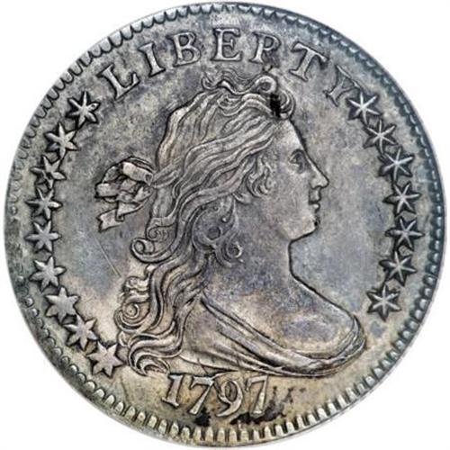 <B>1797 10C 16 Stars--Reverse Repaired--NCS. AU Details.</B></I> JR-1, R.4. One of only two die marriages for the date, each of which is scarce and a separate <I>Guide Book</B></I> variety. This darkly toned example has an impressively sharp obverse, but the eagle is tooled, most prominently on the wings and head.<BR><BR><B>Coin Engraver:</B> Robert Scot<BR><BR><b>Shipping:</b> Coins & Currency (<a target="_blank" href="http://www.heritageauctions.com/common/shipping.php">view shipping information</a>)
