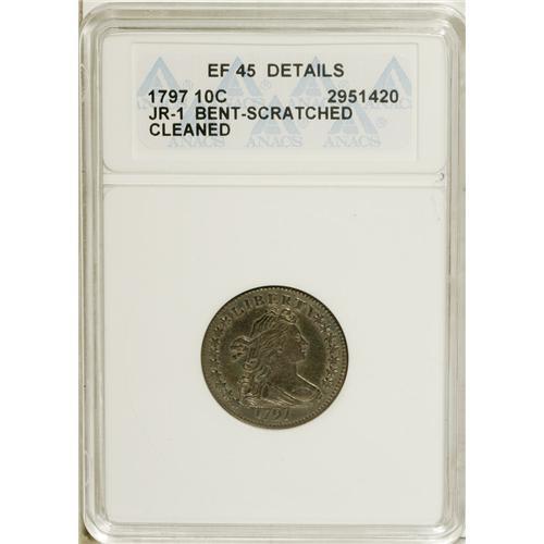 <B>1797 10C 16 Stars--Bent, Scratched, Cleaned--ANACS. XF45 Details. </B></I> JR-1, R.4. An old bend does show around Liberty's neck area, and a single, straight-line pinscratch runs on the reverse from the left upright of the first T in STATES down onto the eagle's breast. A couple of smaller pinscrapes are noted in the left obverse field. Despite these caveats, however, this coin retains significant appeal, as a nice example of the very scarce 16 Stars subtype. The fields have retoned nicely in shades of aqua and pinkish-silver.<BR><I>Ex: Stack's 71st Anniversary Sale (10/2006), lot 2646.</B></I><BR><BR><b>Shipping:</b> Coins & Currency (<a target="_blank" href="http://www.heritageauctions.com/common/shipping.php">view shipping information</a>)