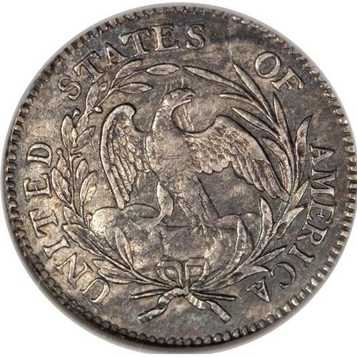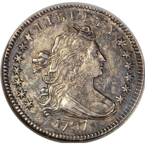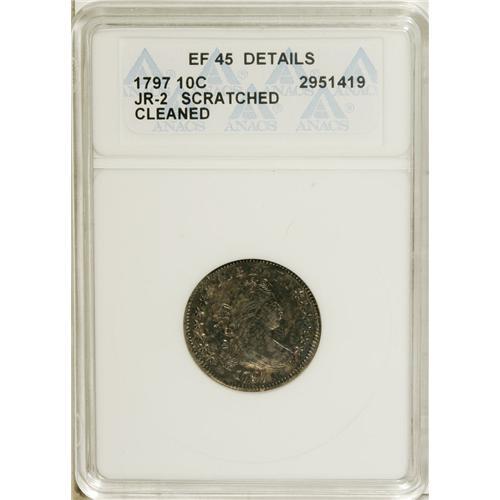 <B>1797 10C 13 Stars--Scratched, Cleaned--ANACS. XF45 Details.</B></I> JR-2, R.4. After Tennessee became the 16th state to join the Union on June 1, 1796, the fledgling Mint produced numerous dies with 16 stars, but at some point Mint Director Elias Boudinot apparently realized that the nation's coin designs could not continually add new stars for every new state. The die for this dime was likely produced after the Mint had standardized on 13 stars for the "Original 13" states.<BR> Type collectors, take special note of this coin, a pleasing (ANACS caveats notwithstanding) example of the two-year Draped Bust, Small Eagle type. Neither of the ANACS provisos carries much weight or severity: The two crisscrossing pinscratches on the cheek are neither deep nor distracting, and despite a possible old cleaning, the coin's surfaces have retoned quite nicely into pretty pink-gray, silver-gold, and ice-blue hues. The piece shows the typical weakness on the eagle's breast, but otherwise there are no singular distractions. Seldom seen in Mint State.<BR><I>Ex: Stack's 71st Anniversary Sale (10/2006), lot 2647.</B></I><BR><BR><b>Shipping:</b> Coins & Currency (<a target="_blank" href="http://www.heritageauctions.com/common/shipping.php">view shipping information</a>)