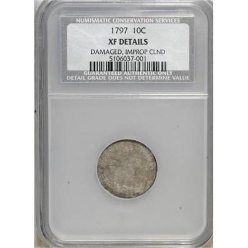 <B>1797 10C 16 Stars--Damaged, Improperly Cleaned--NCS. XF Details.</B></I> JR-1, R.4. This piece has advantages such as a strong strike, sharp remaining details, and splashes of gold toning over light silver surfaces. It also has its disadvantages, such as surface roughness, scratches, and discoloration. While it will not appeal to everyone, a certain market segment will be delighted by the current opportunity.<BR><BR><B>Coin Engraver:</B> Robert Scot<BR><BR><b>Shipping:</b> Coins & Currency (<a target="_blank" href="http://www.heritageauctions.com/common/shipping.php">view shipping information</a>)