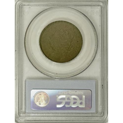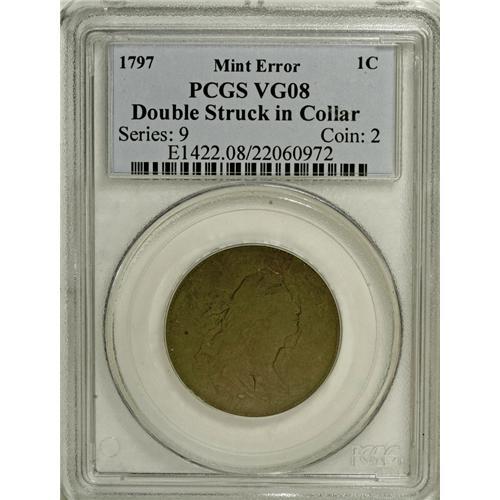<B>1797 1C --Double Struck in Collar--Reverse of 1797, Stems VG8 PCGS.</B></I> S-141, B-18, R.4. This dramatic error cent appeared as lot 563 in the Feb. 1975 Pine Tree EAC auction as part of the Dr. Conway Bolt Collection of Early Copper Mint Errors, and is cited in Walter Breen's Large Cent Encyclopedia. The dies rotated approximately 15 degrees clockwise between strikes, causing a jumble of design details. Two profiles and two bust truncations are present, and both impressions of OF and ONE CENT are legible. A few edge nicks are visible from the reverse, but the surfaces are otherwise problem-free. EAC 6.<BR><BR><b>Shipping:</b> Coins & Currency (<a target="_blank" href="http://www.heritageauctions.com/common/shipping.php">view shipping information</a>)