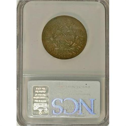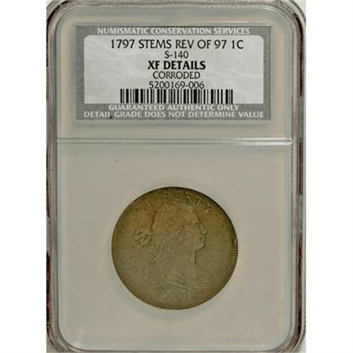 <B>1797 1C Reverse of 1797, Stems--Corroded--NCS. XF Details.</B></I> S-140, B-22, R.1. This sharply delineated example is consistently and moderately granular. The forehead and drapery are abraded, and the obverse rim is nicked at 3 o'clock. The reverse is doubled, the result of a double strike with slight reverse die rotation between blows. EAC 15.<BR><BR><B>Coin Engraver:</B> Robert Scot<BR><BR><b>Shipping:</b> Coins & Currency (<a target="_blank" href="http://www.heritageauctions.com/common/shipping.php">view shipping information</a>)