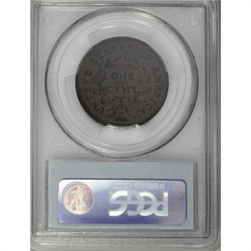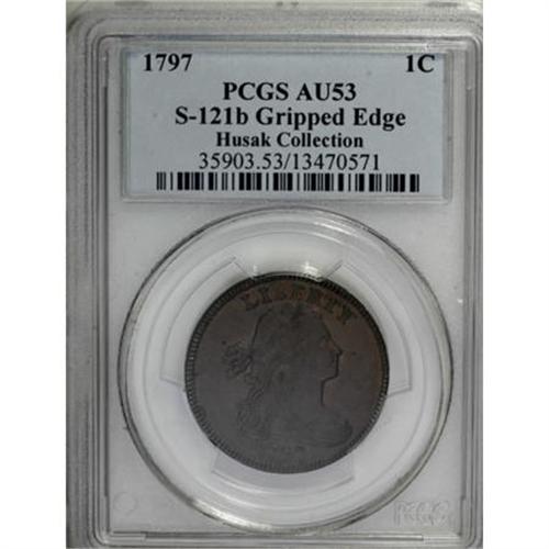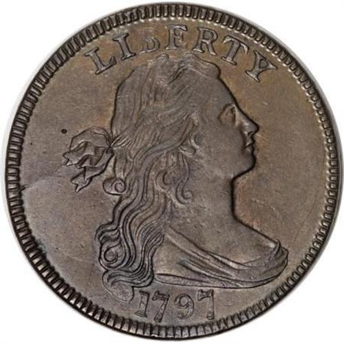 <B>1797 1C Reverse of 1795, Gripped Edge. AU53 PCGS. S-121b, B-3b, R.3.</B></I> <B>Bland XF45; tied for CC-5. Noyes XF40; tied for CC-5. Photo #23958. Our EAC Grade XF45.<BR><BR>Equivalents.</B></I> Proskey 1; Doughty 93; McGirk 1A, 1B, 1C, 1D, 1E; Clapp-Newcomb 3; EAC 3b; <I>Encyclopedia</B></I> 3b; PCGS #1416.<BR><B><BR>Variety. </B></I>Close date. Reverse of 1795. The obverse appears on S-121a and S-121b. The reverse appears on 1796 S-90, 1797 S-120, S-121, and NC-1. Gripped Edge.<BR><B><BR>Surfaces. </B></I>This example has a 29.1-mm diameter and weighs 169.7 grains. Lovely tan and chocolate-brown surfaces are nearly mark-free, with traces of luster remaining. A tiny mark above the top ribbon end in the left obverse field and a faint vertical planchet line between S and O verify the provenance.<BR><B><BR>Die State IV.</B></I> The obverse die is extensively cracked, although the crack through ERT is not as well developed as the S-121a, above. The reverse is heavily clash marked.<BR><B><BR>Appearances. </B></I>The obverse and reverse are illustrated in Noyes (2007).<BR><B><BR>Census.</B></I> Two Mint State pieces and an AU are recorded by Bland; the AU in the ANS Collection.<BR><B><BR>Commentary.</B></I> The S-120 and S-121 die combinations present the only opportunity for collectors to obtain a 1797 cent with the 1796 Reverse, identified by single leaves at the top of both branches of the wreath.<BR><B><BR>Provenance.</B></I> <I>Hollinbeck Stamp & Coin Co. (5/1950), lot 3839; Hollinbeck Stamp & Coin Co. (9/1951), lot 957; Hollinbeck Coin Co. (5/1953), lot 483; Glen Wallace; Abe Kosoff; RARCOA (5/1974), lot 838; C. Douglas Smith (8/1976); G. Lee Kuntz (Superior, 10/1991), lot 135, $6,050; Douglas F. Bird (8/1995); Dr. Philip W. Ralls.</B></I><BR><B><BR>Personality.</B></I> The <B>Governor & Company of Copper Miners</B></I> was incorporated in the late 17th century, with operations in England, Ireland, and eventually Wales. The Mint purchased about 15 tons of copper from Governor and Company in two deliveries, dated October 16, 1796, and October 31, 1797. William Coltman was the Mint's contact. Coltman and Governor & Company were recommended by Thomas Clifford, who had sold copper to the Mint in February 1796.<BR><BR><b>Shipping:</b> Coins & Currency (<a target="_blank" href="http://www.heritageauctions.com/common/shipping.php">view shipping information</a>)