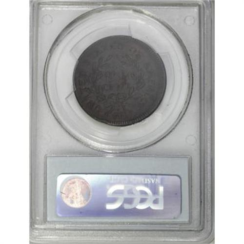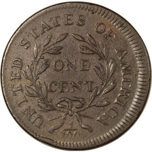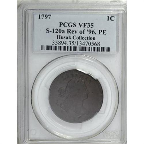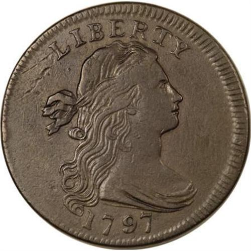 <B>1797 1C Reverse of 1795, Plain Edge. VF35 PCGS. S-120a, B-2a, R.3. </B></I> <B>Noyes VF20; tied for CC-10. Photo #59260. Our EAC Grade VF20.<BR><BR>Equivalents.</B></I> Proskey 3; Doughty 94; McGirk 2A, 2B, 2C, 2D; Clapp-Newcomb 2; EAC 2a; <I>Encyclopedia</B></I> 1700; PCGS #1419.<BR><B><BR>Variety. </B></I>Wide date, 97 close. Reverse of 1795. The obverse appears on S-120a and S-120b. The reverse appears on 1796 S-90, 1797 S-120, S-121, and NC-1. Plain Edge.<BR><B><BR>Surfaces. </B></I>A jumbo example on a larger than normal flan, 29.4.mm and 168.2 grains. The surfaces are smooth and attractive with a trace of microscopic porosity. Medium olive with lighter orange-brown color, probably cleaned and recolored. Imperfectly centered with a wide border to the right, narrow to the left.<BR><B><BR>Die State I. </B></I>Perfect dies with no cracks or bulges.<BR><B><BR>Appearances. </B></I>The obverse and reverse are illustrated in Noyes (2007).<BR><B><BR>Census.</B></I> A single Mint State example is known, with one or two AU pieces. The roster drops quickly through the XF grades and down to the VF level. Two of the top 10 are ANS coins, placing this example in a tie for eighth best available to collectors.<BR><B><BR>Commentary.</B></I> The so-called Plain Edge cents, S-120a and S-121a, are better described as Beaded Edge coins, with elongated beads or pellets around most or all of the circumference. Several different edge styles are known for the 1797 and 1798 cents, providing additional clues for the study of emission sequences. Breen attempted to relate the edge styles to planchet sources, although there seems to be little solid evidence. He wrote in his <I>Large Cent Encyclopedia</B></I>: "The theoretical goal for 1794-1814 cents is to identify unambiguously each type of planchet used on any variety; if possible naming its source, inclusive dates of manufacture, and sometimes even the aggregate mintage of varieties from distinguishable planchet shipments."<BR><BR><B>Provenance.</B></I> <I>Heritage (1/1998), lot 5042; Dr. Wallace Lee; Superior (5/2003), lot 416, $2,415.</B></I><BR><BR><B>Personality.</B></I> A dentist who was born in Pontiac, Michigan, in 1929, <B>Dr. Wallace Lee</B></I> practiced for 35 years until his retirement in 1994. He began collecting coins in 1962 and became interested in large cents through purchase of pieces at auction with the goal of a date set. His collection was sold by Superior in May 1993.<BR><BR><b>Shipping:</b> Coins & Currency (<a target="_blank" href="http://www.heritageauctions.com/common/shipping.php">view shipping information</a>)