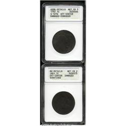<B>1797<1C> Reverse of 1796, Gripped Edge--Off Center, Damaged, Corroded--ANACS. Good Details, Net Fair 2,</B></I> S-121b, Low R.3, struck 10% off center toward 7 o'clock, edge damage at 5 o'clock on both sides, numerous small digs, wavy surfaces; and an <B>Undated Draped Bust Large Cent--Off-Center, Damaged, Scratched--ANACS, AG Details, Net Fair 2,</B></I> struck 15% off center toward 10 o'clock, there are flower counterstamps and pinscratches on the obverse center, the date is well worn but is most likely 1800 or 1802. 2 Coins <BR><BR><B>Important notice:</B> Heritage usually auctions material at the rate of 200-250 lots per hour. On some occasions eBay Live bid software or the Internet may not be able to keep up with the pace of the auction. We recommend placing a realistic absentee bid now as insurance to avoid disappointment. Occasionally the auctioneer may eliminate or reject an eBay Live bid, and the auctioneer may also reopen a lot after the close of the eBay live bidding (usually because we missed an audience bid), and may reject your bid even if it shows you as the winning bidder. By bidding via eBay Live, you agree that Heritage may award the lot to another bidder at its sole discretion under the circumstances described above or any other reasonable circumstances. Since eBay bids are not shown to us until we open the lot on the floor, we treat those bids just like floor bids. In most cases the floor responds before the eBay bid is presented to us, due to Internet lag time, so for consistency we have made it a policy that floor bids are always considered first over tie eBay live bids. Also please note that all Heritage lots purchased through eBay Live carry a 20% Buyer's Premium. Please make sure you read the Terms and Conditions before you bid. </span></font></tr></table></td></tr></table>