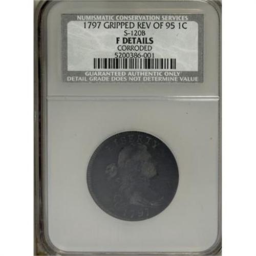 <B>1797 1C Gripped Edge, Reverse of 1795--Corroded--NCS. Fine Details.</B></I> S-120b. NGC Census: (0/0). PCGS Population (0/1). (#35900)<BR><BR><b>Shipping:</b> Coins & Currency (<a target="_blank" href="http://www.heritageauctions.com/common/shipping.php">view shipping information</a>)