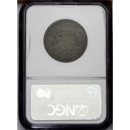 <B>1797<1C> Reverse of 1796, Plain Edge. S-120a, B-2a, High R.3. VF20 NGC. Fine 12 EAC.</B></I> Splendid olive-brown color with deep orange around the devices on the reverse. A lovely example for the grade. A middle die state with a faint die crack through the tops of LIBERTY. Considerable weakness of the details is noted on the reverse.<BR><I>Ex: George Ramont (8/12/1976).</B></I> Envelope Included.