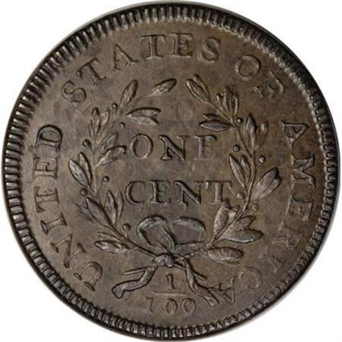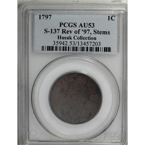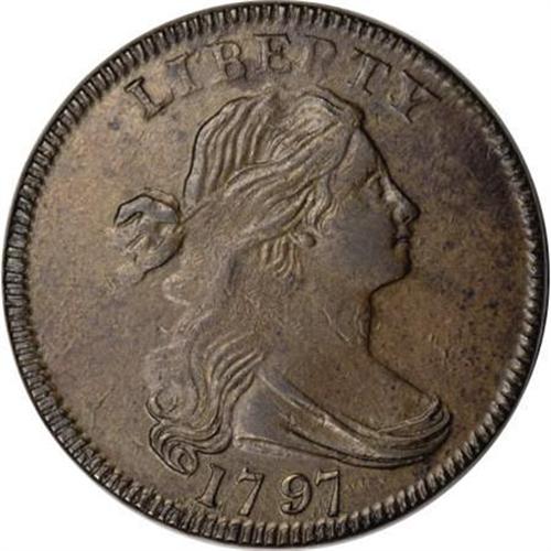 <B>1797 1C Reverse of 1797. AU53 PCGS. S-137, B-8, R.2.</B></I> <B>Bland VF35; tied for CC-10. Noyes VF35; tied for CC-7. Photo #21165. Our EAC Grade VF35.<BR><BR>Equivalents.</B></I> Proskey 10; Doughty 101; McGirk 13A; Clapp-Newcomb 20; EAC 16; <I>Encyclopedia</B></I> 1706; PCGS #1422.<BR><B><BR>Variety. </B></I>Wide date, 97 close and low. First S repunched below. The obverse appears on S-136 and S-137. The reverse appears on S-137.<BR><B><BR>Surfaces.</B></I> Most of the design details are bold, except for considerable weakness at the central obverse. Both sides have light tan color, possibly retoned, with splashes of darker steel and lilac on the obverse and some maroon and green patina on the reverse, the result of minor corrosion on that side. A nicely centered impression with complete obverse border details and bold reverse border details. Beaded Edge.<BR><B><BR>Die State III.</B></I> The reverse is bulged through ICA and cracked from the border to the right ribbon end.<BR><B><BR>Appearances. </B></I>The obverse and reverse are illustrated in Noyes (2007).<BR><B><BR>Census.</B></I> The top four pieces include two AU and two XF coins, followed by a number of VF pieces, including this coin that just misses the traditional census of the six finest.<BR><B><BR>Commentary.</B></I> The Beaded Edge coins are seemingly rarer than those with Plain Edge. Breen only knew of two Beaded Edge pieces, one in Jack Beymer's inventory in 1987, and the other quite low-grade. Although the different edge types have been known for quite some time, they remain relatively ignored today. <BR><BR><B>Provenance.</B></I> <I>Philip E. Beneditti (Pickwick Coin Co.); Hollinbeck-Kagin (2/1963), lot 2170; Hollinbeck-Kagin (8/1964), lot 161; Hollinbeck-Kagin (1/1973), lot 267; Kagin's (9/1980), lot 123; Kagin's (3/1984), lot 1203; 1986 ANA (Kagin's), lot 5158; Dr. Feori Pipito; Superior (9/1987), lot 968.</B></I><BR><BR><B>Personality.</B></I> Along with E.V. Boone, <B>Philip E. Beneditti</B></I> was a driving force behind Pickwick Coin Company. The firm advertised in both <I>The Numismatist</B></I> (beginning in 1962) and <I>Numismatic Scrapbook</B></I>. To quote Q. David Bowers in <I>The American Numismatic Association Centennial History</B></I>, "Pickwick went on to handle many important coin properties, particularly in the field of early American, colonial, and state coins."<BR><BR><b>Shipping:</b> Coins & Currency (<a target="_blank" href="http://www.heritageauctions.com/common/shipping.php">view shipping information</a>)