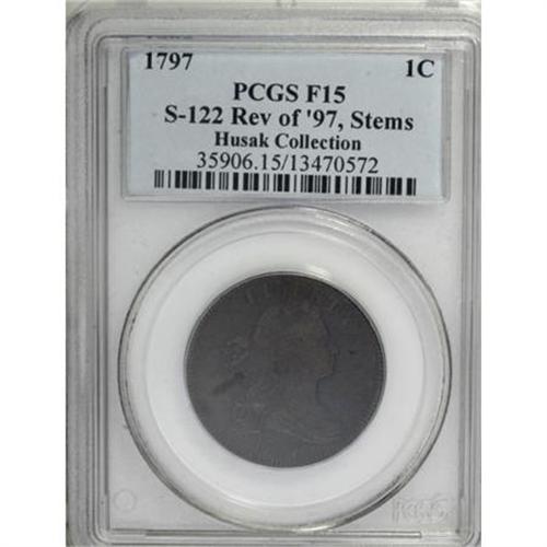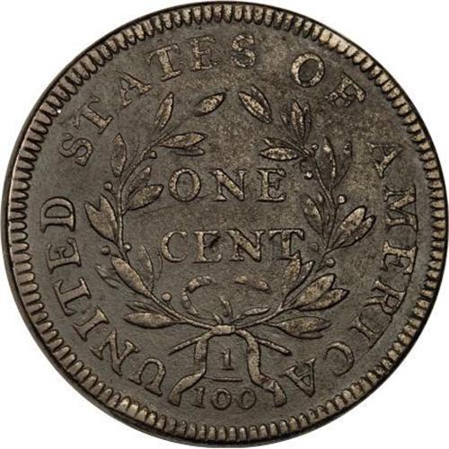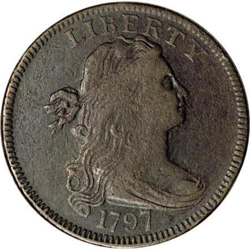 <B>1797 1C Reverse of 1797. Fine 15 PCGS. S-122, B-9, High R.5.</B></I> <B>Bland Fine 12; tied for CC-2. Noyes VG10; tied for CC-4. Photo #27610. Our EAC Grade Fine 12.<BR><BR>Equivalents.</B></I> Clapp-Newcomb 4; EAC 9; <I>Encyclopedia</B></I> 1711; PCGS #1422.<BR><B><BR>Variety. </B></I>Extremely close date. Five berries left and right, 1 touches left ribbon. The obverse appears on S-122, S-123, NC-2, and NC-3. The reverse appears on S-122.<BR><B><BR>Surfaces.</B></I> Both sides are lightly porous, with a few additional scratches and other blemishes. Medium steel-brown with lighter tan on the highpoints of the devices. The overall appearance is still nice, despite the surface issues.<BR><B><BR>Die State II.</B></I> The reverse is cracked through the tops of MERIC.<BR><B><BR>Appearances.</B></I> The reverse is illustrated in <I>Early American Cents, Penny Whimsy</B></I>, and Noyes (1991 and 2007).<BR><B><BR>Census.</B></I> Only 30 to 40 examples of this die combination are known, all in lower grades. In fact, the finest known grades just VF20 per Bland, or Fine 15 per Noyes. Bland calls this example from the Husak Collection tied for second finest known.<BR><B><BR>Commentary.</B></I> Breen believed that the S-122 cents may have been coined on a particular batch of planchets from Boulton that became damaged and discolored in transit. Higher grade pieces (VG to Fine in this instance) generally have full borders, ruling out the possibility that they were struck on the concave planchets from Coltman.<BR><B><BR>Provenance.</B></I> <I>Richard Picker (7/1965); C. Douglas Smith (12/1983); Jack H. Robinson (Superior, 1/1989), lot 233; John R. Frankenfield (Superior, 2/2001), lot 349; Bowers and Merena (8/2005), lot 111; Chris Victor-McCawley.</B></I><BR><B><BR>Personality.</B></I> <B>Joseph Cloud</B></I> was born in East Bradford, Pennsylvania, in 1760. On January 2, 1797, he was commissioned as melter and refiner at the Mint. Evans notes that he served in that capacity until 1836, and it is believed this was the year of his death. Federal Census records for 1800, 1820, and 1830 all record a Joseph Cloud living in the North Ward of Philadelphia. The 1840 Federal Census records no any such person, consistent with a death date of 1836.<BR><BR><b>Shipping:</b> Coins & Currency (<a target="_blank" href="http://www.heritageauctions.com/common/shipping.php">view shipping information</a>)