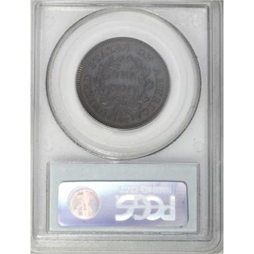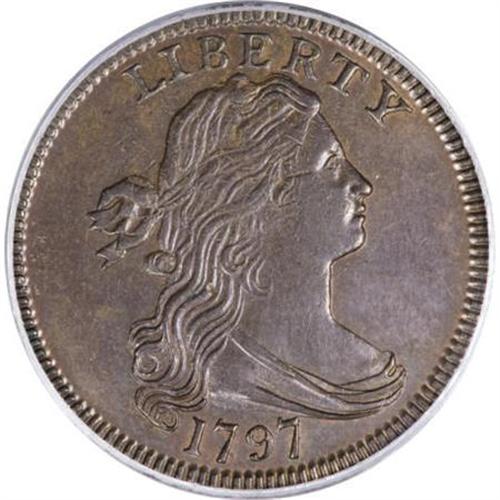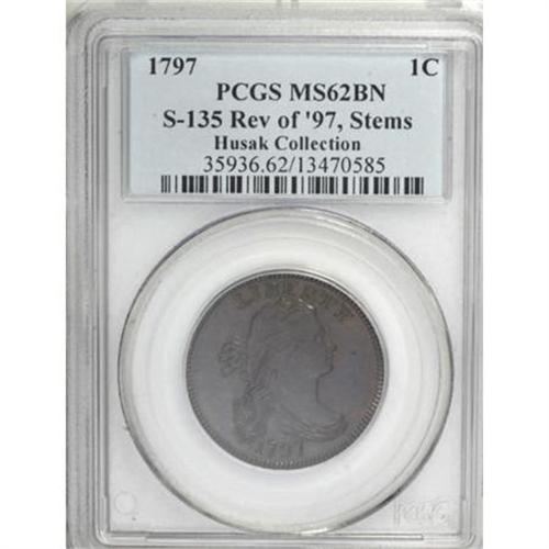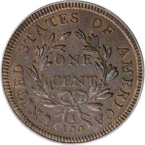 <B>1797 1C Reverse of 1797. MS62 Brown PCGS. S-135, B-5, R.3. </B></I> <B>Noyes AU50; tied for CC-19. Photo #39164. Our EAC Grade AU55.<BR><BR>Equivalents.</B></I> Proskey 9; Doughty 100; McGirk 15A, 15B, 18A; Clapp-Newcomb 18; EAC 13; <I>Encyclopedia</B></I> 1709; PCGS #1422.<BR><B><BR>Variety. </B></I>Medium date, 7 touches drapery, broken B. Six berries in each branch, wide 100. The obverse appears on S-125 and NC-6. The reverse appears on S-135.<BR><B><BR>Surfaces.</B></I> Excellent cartwheel luster with pleasing olive and tan surfaces. The reverse has traces of faded red color, mostly through the legend. The normal blunt strike is evident in the upper obverse and lower reverse details, with some original flan defects showing at those locations. The surfaces are pristine and the fields are faintly reflective. <BR><B><BR>Die State IV.</B></I> The reverse has a faint die bulge at D ST and a single clash mark near ES O.<BR><B><BR>Census.</B></I> A number of Mint State coins are known from the Nichols Find. It is actually rare to find pieces in circulated grades.<BR><B><BR>Commentary.</B></I> Sheldon-135 generally comes nicer than either of the other two Nichols Find coins. Many have original mint red color and prooflike or reflective fields. It is also more plentiful than either S-119 or S-123. In <I>Early American Cents</B></I> and in <I>Penny Whimsy,</B></I> Sheldon discussed the general appearance of the Nichols Find cents: "On these three varieties the planchets have a high polish or ‘prooflike' luster; all show the same finish on the rims; the denticles are deep and heavy; two of the reverses are identical and the third varies only triflingly from them; in all cases the dies had been slightly injured or blunted, especially the reverse dies."<BR><BR><B>Provenance.</B></I> <I>Chris Victor-McCawley (9/1995).</B></I><BR><BR><B>Personality.</B></I> <B>Peter LaChase</B></I> (a.k.a. Peter LaChaize or LaChaise) was employed by the Mint on or before January 1793, when he signed the Mint Rules and Regulations document, the equivalent of today's company handbook. The January 1796 payroll lists him as a melter.<BR><BR><b>Shipping:</b> Coins & Currency (<a target="_blank" href="http://www.heritageauctions.com/common/shipping.php">view shipping information</a>)