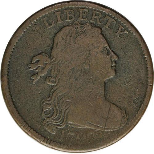 <B>1797<1C> Reverse of 1797, No Stems. S-133, B-29, R.5--Environmental Damage--NCS. Fine Details. VG7 EAC.</B></I> Die State III. On the reverse five dentils are joined above IC, and there is a faint die crack through ATE. Some clash marks show faintly on the obverse of this specimen, but the surfaces are rough, porous, and pitted. The planchet is dark-brown. Two long, shallow scratches cross to the rim from the top of the bust, and there is a scrape on Liberty's neck. There are a couple of nicks near the lower reverse rim, and the fraction is weak, but the reverse is otherwise attractively detailed. Envelope Included.