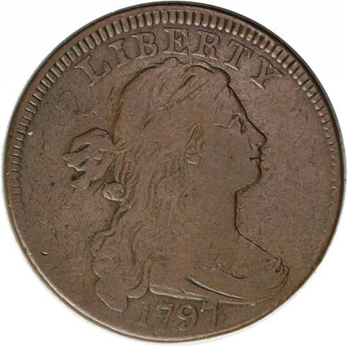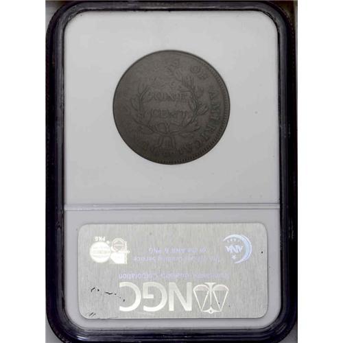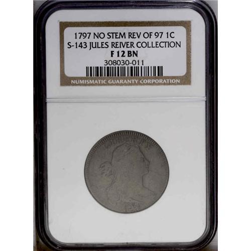 <B>1797<1C> Reverse of 1797, No Stems. S-143, B-31, Low R.5. Fine 12 NGC. VG8 EAC.</B></I> Die State I. This obverse in the Sheldon numbering system features the premiere of the Style II letters, with a curved tail on the R among other characteristics. The 7 on this variety is embedded into the drapery, while the reverse hallmark is, of course, the lack of wreath stems. Faint clash marks aid in identifying the various die states. While it is possible this coin is from a later die state, the clash marks diagnostic of Die State I are visible at Liberty's throat. (There is no reverse die crack visible in the field near D, however; that area is weakly struck.) This example has numerous grade-consistent contact marks that may mask other die clashes. The strike is weak at the lower left obverse and the upper left reverse, but the coin is pleasingly detailed for the grade and struck on a medium-brown, slightly glossy planchet.<BR><I>Ex: Chuck Furjanic (4/1978); Dr. Willard Carmel; Del Bland (1982).</B></I> Envelope Included.