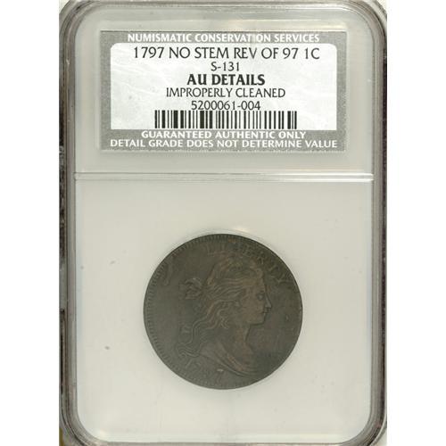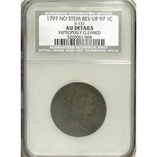 <B>1797 1C Reverse of 1797, No Stems--Improperly Cleaned--NCS. AU Details.</B></I> S-131, B-27, R.3. Effects of minor corrosion are primarily visible on the reverse of this sharply detailed example. Careful cleaning is mostly visible on the obverse in the form of lighter tan color. EAC 20.<BR><BR><b>Shipping:</b> Coins & Currency (<a target="_blank" href="http://www.heritageauctions.com/common/shipping.php">view shipping information</a>)