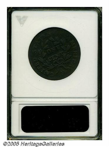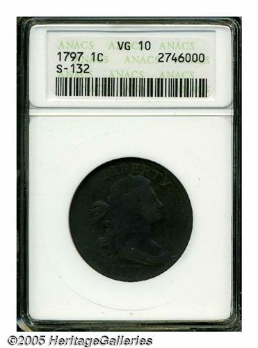<B>1797<1C> Reverse of 1797, No Stems VG10 ANACS.</B></I> S-132, Low R.5. Two different stemless reverse dies were combined with 1797-dated obverse dies to form five different varieties. None of the five are common, and only one is scarce, with the other four all being rarities. Heavy, even wear is seen on each side with even, deep brown patina.
