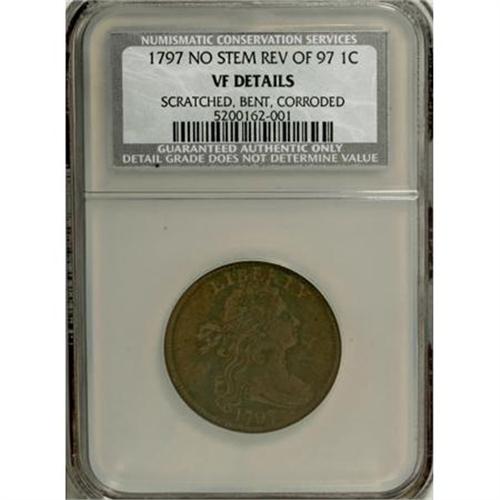 <B>1797 1C Reverse of 1797, No Stems--Bent, Corroded, Scratched--NCS. VF Details.</B></I> NGC Census: (1/3). PCGS Population (3/4). Mintage: 897,510. Numismedia Wsl. Price for NGC/PCGS coin in XF40: $1,575. (#1425)<BR><BR><B>Coin Engraver:</B> Robert Scot<BR><BR><b>Shipping:</b> Coins & Currency (<a target="_blank" href="http://www.heritageauctions.com/common/shipping.php">view shipping information</a>)