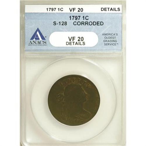 <B>1797 1C --Corroded--ANACS. VF20 Details.</B></I> S-128. NGC Census: (0/0). PCGS Population (0/1). (#35924)<BR><BR><b>Shipping:</b> Coins & Currency (<a target="_blank" href="http://www.heritageauctions.com/common/shipping.php">view shipping information</a>)