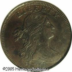 <B>1797 1C Reverse of 1797, Stems AU50 NGC.</B></I> S-128, Low R.3. An interesting and easily identified variety as the second 7 in the date has both points touching the bottom of the bust, and on the reverse the M in AMERICA is clearly punched over an E. Well centered, the dies appear to have been misaligned slightly with a resultant loss of detail on the lower rim of each side. Medium, even brown color with a couple of very minor abrasions on the obverse. Lot:5121