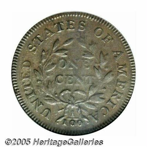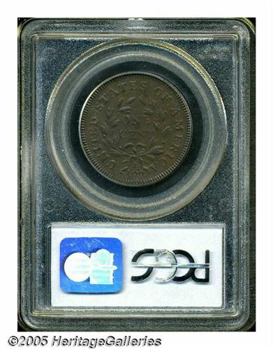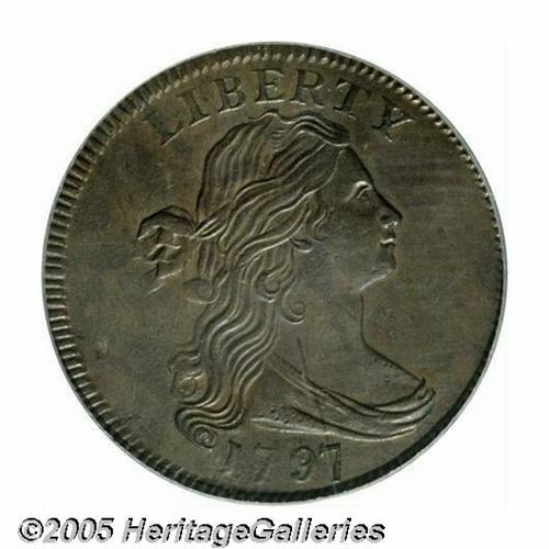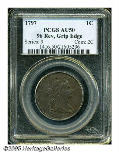 <B>1797<1C> Reverse of 1797, Stems AU50 PCGS.</B></I> S-136, Low R.3. Designated by PCGS as a Reverse of 1796, Gripped Edge variety, however, the right side of the wreath terminates with a double leaf. Struck from an 'injured' reverse die; according to Noyes, "The die must have been injured by coming into contact with some smooth object." The obverse and all legends are well struck. The chocolate-brown surfaces are nearly unabraded. Select areas of inconspicuous granularity are observed on the obverse field. Struck from a boldly clashed reverse die.