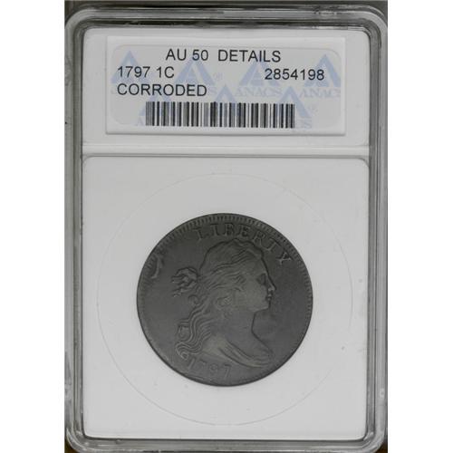 <B>1797<1C> Reverse of 1797, Stems--Corroded--ANACS. AU50 Details.</B></I> S-130, B-25, R.2. The corrosion is relatively mild, and mostly limited to the right obverse field. This dark brown piece has a curved impression above the obverse rim at 6 o'clock; this could be a strike-through although inspection is suggested. EAC 10.