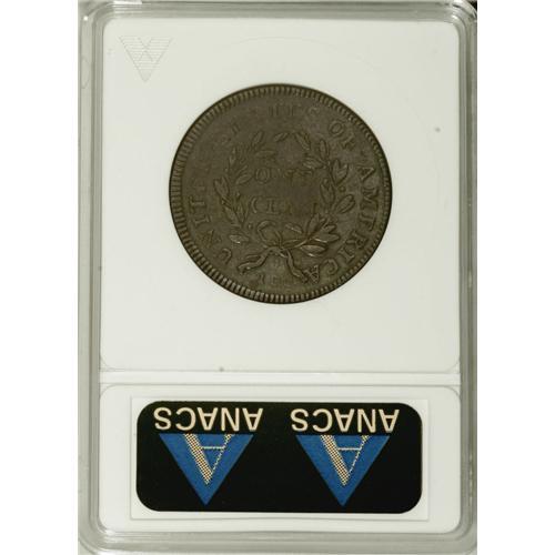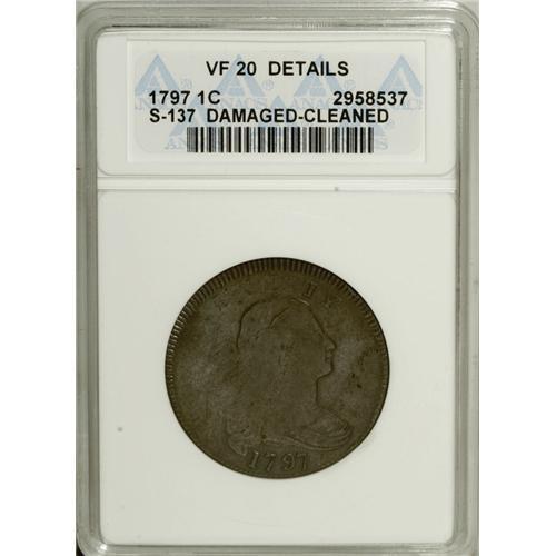 <B>1797 1C Reverse of 1797, Stems--Damaged, Cleaned--ANACS. VF20 Details.</B></I> S-137, R.2. This variety has a distinctive reverse die with the first S of STATES recut below; also there are six berries on the left branch, and five on the right. On the obverse, the 7 and 9 are widely spaced, and 97 almost touch. Shiny brown surfaces are lightly hairlined, and some puncture marks are noted in the right obverse field, and a scratch in the lower left obverse. What appears to be a strikethrough is visible on Liberty's portrait. EAC 8.<BR><BR><b>Shipping:</b> Coins & Currency (<a target="_blank" href="http://www.heritageauctions.com/common/shipping.php">view shipping information</a>)