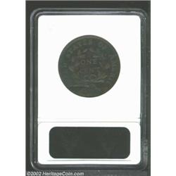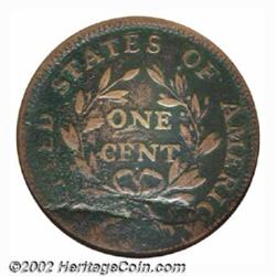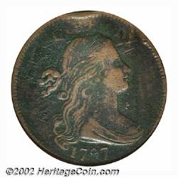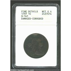 1797 1C Reverse of 1797, Stems--Damaged, Corroded--ANACS. Fine Details, Net Good 4. S-141, High R.4. The fields are dark and somewhat rough, while the highpoints of the devices are reddish-brown in color. LIBERTY and the fraction are faint. The upper obverse and lower reverse are affected by a bend in the planchet, while the obverse rim has an indentation above the Y in LIBERTY. The major devices have rich details. Important notice: We expect to be auctioning lots at the rate of 200-250 per hour. Sometimes eBay Premier live bid software cannot keep up with that pace, so we strongly recommend that you place a realistic proxy bid now as insurance to avoid disappointment. Also please note that all Heritage/CAA lots purchased through eBay Premier carry a 20% Buyer's Premium. Please make sure you read the Terms and Conditions.