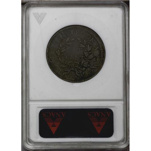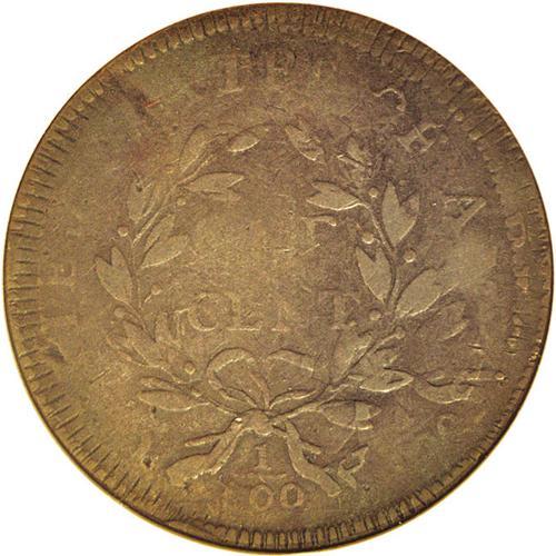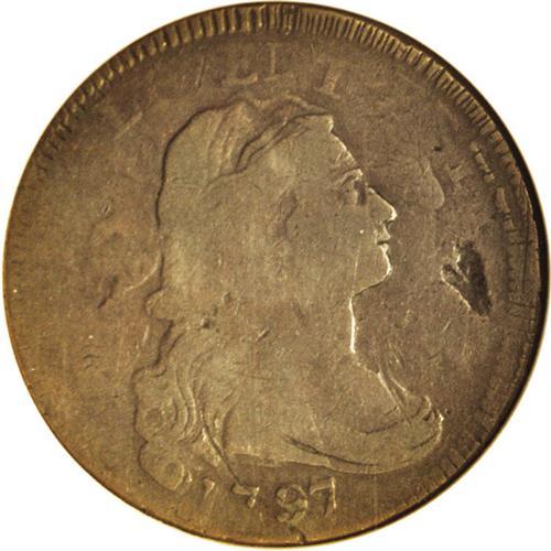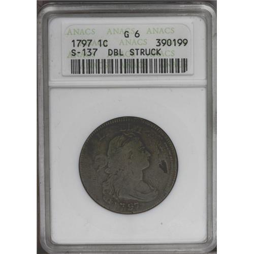 <B>1797<1C> Reverse of 1797, Stems--Double Struck--Good 6 ANACS.</B></I> S-137, B-8, R.2. The second strike is rotated approximately 50 degrees counterclockwise relative to the first impression. Best evidence of an earlier strike is the presence of ERTY between 2 and 3 o'clock on the obverse, and a full fraction from the initial strike is noted at 4:30 on the reverse. Environmental granularity is minimal, and the only noticeable defects are a reverse rim ding at 7 o'clock and an obverse field depression near 3 o'clock. EAC 5.