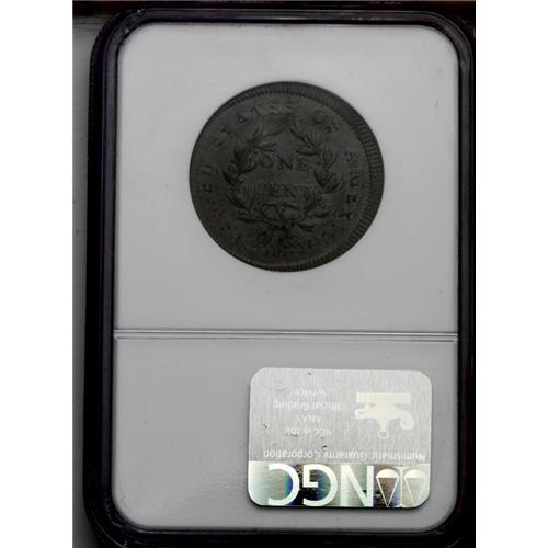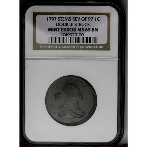 <B>1797<1C> Reverse of 1797, Stems--Double Struck--MS65 Brown NGC.</B></I> S-135, R.3. Regardless of date, any Mint State Draped Bust large cent is important, and few are available from the earliest years. Thanks to the Nichols Find of 1796 and 1797 Draped Bust large cents, type collectors can strive to acquire a high quality piece. All three varieties, 1796 S-119, 1797 S-123, and this S-135 variety, are more plentiful in Mint State grades than they are in circulated grades. In fact, it is only through the Nichols Find that these varieties do not have an R.5 rating.<BR> This example has an additional cache as it is fully double struck on both sides. The two strikes are closely overlapping, and yet it is far more than a mere double profile. Every detail is fully and obviously doubled, including the date, LIBERTY, the entire bust, and even the border on the obverse. The reverse is similarly doubled, including the entire wreath, all of the lettering, and the border. There appears approximately 1 mm. of space between each strike. Both sides have smooth and glossy medium brown color with traces of lighter tan, faded from original red. As suggested by the Gem grade assigned by NGC, the surfaces are essentially problem-free, with no evidence of wear on any part of the design. EAC 60.