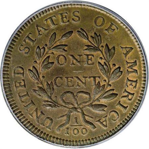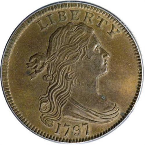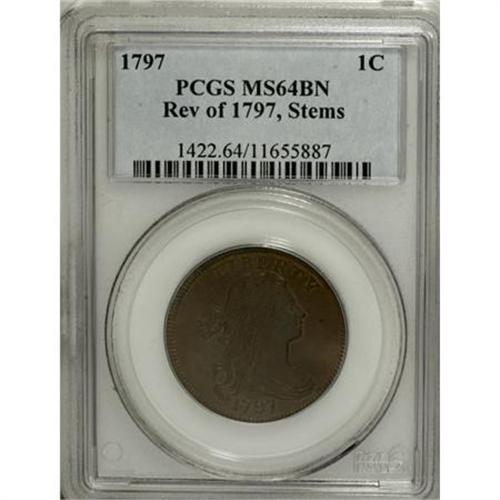 <B>1797 1C Reverse of 1797, Stems MS64 Brown PCGS.</B></I> S-135, B-5, R.3. Breen Die State V with clash marks on both sides. One of the three Nichols Find varieties, along with the S-119 and S-123. Circa-1797, Senator Benjamin Goodhue acquired a bag of 1,000 cents for his daughters. These coins were preserved by Goodhue's descendants until the Civil War. In 1863, David Nichols acquired these coins and distributed them to collectors. Regarding S-135, Breen states, "probably around 70 exist in or near Mint State," a relatively small quantity given current collector demand.<BR> This sharply struck near-Gem is mostly medium brown, but glimpses of its initial red glory emerge from design recesses. The surfaces are remarkably void of contact, and carbon is also surprisingly minimal. A splendid acquisition for a museum-quality early type set. EAC 63.<BR><I>From The Madison Collection.</B></I><BR><BR><B>Coin Engraver:</B> Robert Scot<BR><BR><b>Shipping:</b> Coins & Currency (<a target="_blank" href="http://www.heritageauctions.com/common/shipping.php">view shipping information</a>)