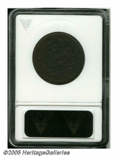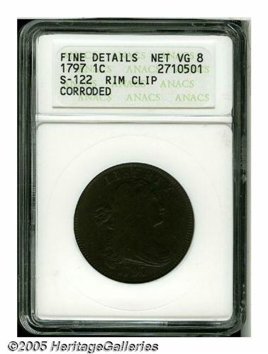 <B>1797<1C> Reverse of 1797, Stems--Rim Clip, Corroded--ANACS. Fine Details, Net VG8.</B></I> S-122, Low R.6. A 3% curved clip at 10 o'clock adds further interest to this example of a rare variety, which in a later state features a dramatic cud above MERI in AMERICA. The present piece has a crack above MERI, as made, but no die break. All legends and even the denticles are crisp, but the reverse has large pits in the field and the surfaces are mildly porous.