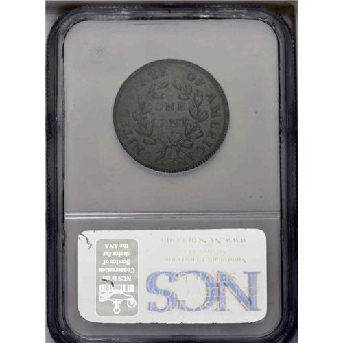 <B>1797<1C> Reverse of 1797, Stems. S-123, B-12, Low R.4--Improperly Cleaned--NCS. AU Details. XF45 EAC.</B></I> A second unusual circulated example of this variety. Smooth olive-brown surfaces with some weakness at the left side of the reverse. Hints of lighter tan on the devices provide the only evidence that this example has been cleaned. A well-centered example of the late die state with the small rim break over AT visible, and also a die crack below the fraction. Struck after 1796 S-119.<BR><I>Ex: Henry C. Hines; Homer K. Downing (New Netherlands, 8/1952), lot 1764; Willard C. Blaisdell (1/9/1971).</B></I> Envelope Included.