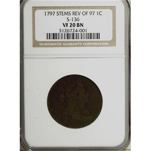 <B>1797 1C Reverse of 1797, Stems VF20 NGC.</B></I> S-136. NGC Census: (4/70). PCGS Population (7/117). Mintage: 897,510. Numismedia Wsl. Price for NGC/PCGS coin in VF20: $625. (#1422)<BR><BR><B>Coin Engraver:</B> Robert Scot<BR><BR><b>Shipping:</b> Coins & Currency (<a target="_blank" href="http://www.heritageauctions.com/common/shipping.php">view shipping information</a>)