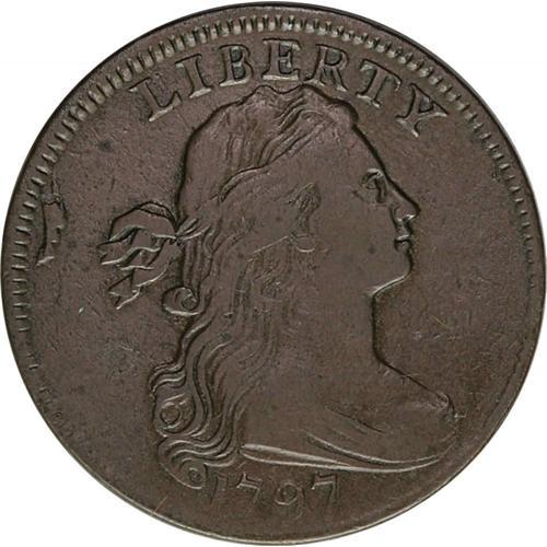 <B>1797<1C> Reverse of 1797, Stems. S-130, B-25, R.2. VF25 NGC and EAC.</B></I> Die State III. This variety shares an obverse with the S-129, the S-131, and the unique "Sheldon NC-8" (B-26). The die cracks behind Liberty's head are advanced. The reverse is another "instant recognizer," with the bow ribbon and many wreath leaves partially effaced through overzealous die polishing. On this example from late in the die state, the two cracks have partially filled in toward each other, but the resulting large crack is not yet complete all the way to the rim. This glossy, appealing example is struck slightly off center on a marginally rough, medium-brown planchet. Because of imperfect centering, the digits in the date are weak at the bottom. Examination under a glass reveals a short reverse scratch from the leaf nearest the O in ONE down to the top of C in CENT. There is a break above the dentils at R. Despite these mere trivialities, this is a desirable coin.<BR><I>Ex: George Ramont (3/29/1971).</B></I> Envelope Included.
