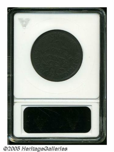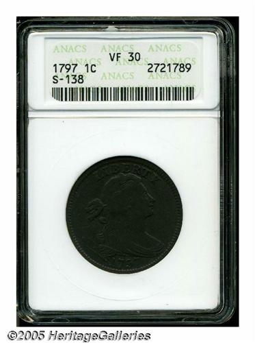 <B>1797<1C> Reverse of 1797, Stems VF30 ANACS.</B></I> S-138, R.1. A handsome mahogany-brown piece with generally smooth surfaces. Much hair and dentil detail is evident. OF is weak, as made from a late state sunken reverse die.
