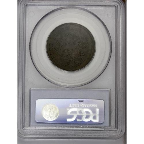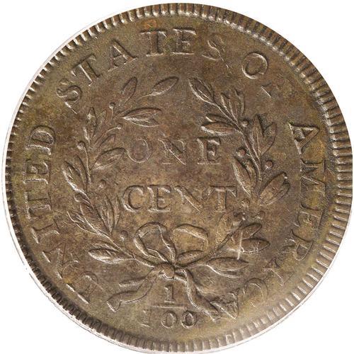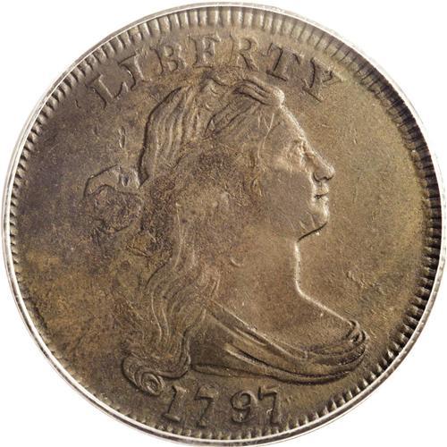 <B>1797<1C> Reverse of 1797, Stems XF40 PCGS.</B></I> S-137, R.3. This variety has a distinctive reverse die with the first S of STATES recut below. The U is far from the left ribbon end, and the final A joins the right ribbon end. This cent has considerable sharpness and is well centered on the planchet. The obverse is a mixture of lighter milk-chocolate and deeper steel-brown colors. The reverse is somewhat deeper in tone with some minor encrustation overall. There are no mentionable marks or abrasions, quite unusual for the grade. A pleasing example of this scarcer variety. EAC 25.