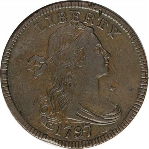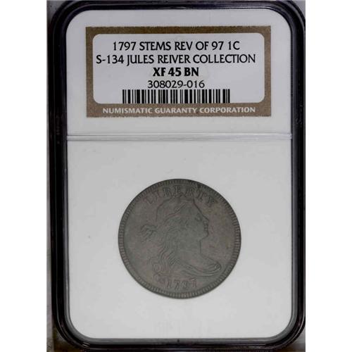 <B>1797<1C> Reverse of 1797, Stems. S-134, B-4, High R.3. XF45 NGC. VF35 EAC.</B></I> Die State IV. This coin has a die crack connecting the 9 and last 7 in the date. There is bulging near the date and lower back curls, with die rust present. There is a die chip in the field before Liberty's throat. Two reverse die cracks above (M)E have joined. This lovely example is well detailed for the grade and struck on a glossy, medium-brown planchet. Examination with a glass shows a light scrape before Liberty's face, with a minute dig above T in LIBERTY. There are no mentionable marks on the hair, face, or neck, and excellent delineation at the demarcation between hairline and forehead. This coin is extremely well centered, with all dentilation showing on the obverse. The reverse dentilation is weak in the lower left quadrant. A lovely and largely problem-free representative of this variety. We do not find this example listed in the Census by either Bland or Noyes, but it probably ranks in the top dozen for the variety.<BR><I>Ex: Redell-Smith (10/28/1957).</B></I> Envelope Included.