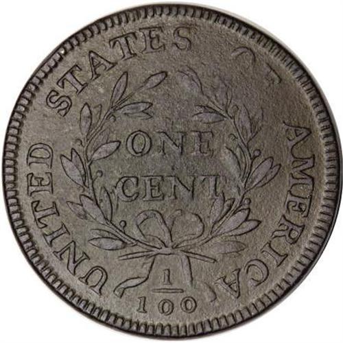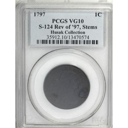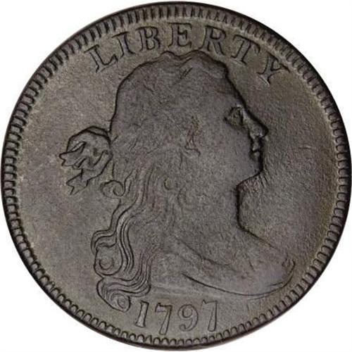 <B>1797 1C Reverse of 1797. VG10 PCGS. S-124, B-14, High R.5.</B></I> <B>Bland VG10; tied for CC-9. Noyes VG8; CC-8. Photo #28861. Our EAC Grade VG10.<BR><BR>Equivalents.</B></I> Clapp-Newcomb 7; EAC 5; <I>Encyclopedia</B></I> 1711; PCGS #1422.<BR><B><BR>Variety. </B></I>Date close, first 7 leans left. E of AMERICA corrected from M. The obverse appears on S-124 and S-125. The reverse appears on S-124.<BR><B><BR>Surfaces. </B></I>The sharpness<B> </B></I>is considerably finer, VF25 per Bland, with heavy deductions for the surface quality. The surfaces have fine, evenly distributed porosity and display olive-brown color.<BR><B><BR>Die State IV.</B></I> An intermediate die state, the obverse displays considerable die bulging, yet not to the extent of obliterating certain details as on later die state examples of this variety.<BR><B><BR>Appearances. </B></I>The obverse and reverse are illustrated in Noyes (2007).<BR><B><BR>Census.</B></I> Only 30 to 35 examples of this important variety are known. Despite its porosity, it is one of the finer surviving examples and is tied for ninth best in the Condition Census. It also ranks third or fourth in terms of existing detail.<BR><B><BR>Commentary.</B></I> Considered Rarity-7 by Sheldon, with only eight or nine examples known in 1958, it only recently broke the Rarity-6 barrier. As recently as 1991, Noyes still rated S-124 Low Rarity-6. Low grade is the rule for the variety, with the finest known barely VF. To make matters worse, most of those known have below-average surface quality.<BR><B><BR>Provenance.</B></I> <I>Michael Kirzner (7/1969); Denis W. Loring (7/1969); C. Douglas Smith (9/1970); Denis W. Loring (9/1970); Robinson S. Brown, Jr. (Superior, 9/1986), lot 177, $1,210; Robinson S. Brown, Jr. (Superior, 1/1996), lot 178, $2,090; Wes Rasmussen (Heritage, 1/2005), lot 3146, $1,265.</B></I><BR><B><BR>Personality.</B></I> Although he was not directly employed by the Mint, <B>Tench Coxe</B></I> played an important role in early Mint history resulting from his association with the Treasury Department during the late 1790s and early 1800s. He was born in Philadelphia on May 22, 1755. Coxe played different roles during the Revolution, including a period as a British loyalist in the late 1770s. In 1789, he was a member of the Continental Congress. He died in Philadelphia on July 17, 1824.<BR><BR><b>Shipping:</b> Coins & Currency (<a target="_blank" href="http://www.heritageauctions.com/common/shipping.php">view shipping information</a>)