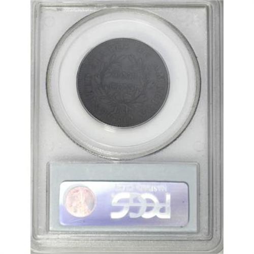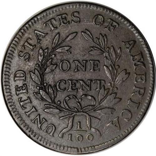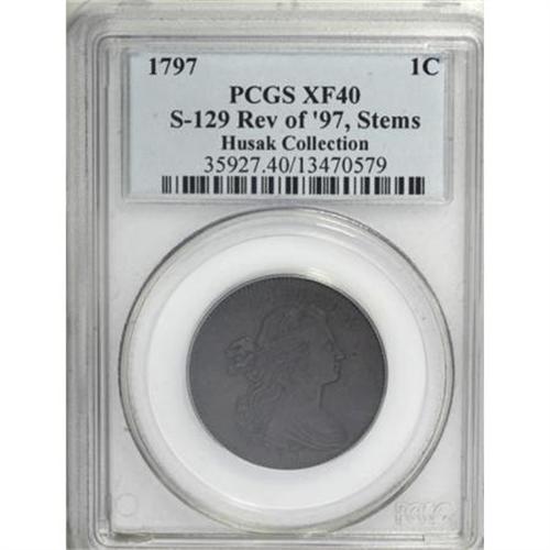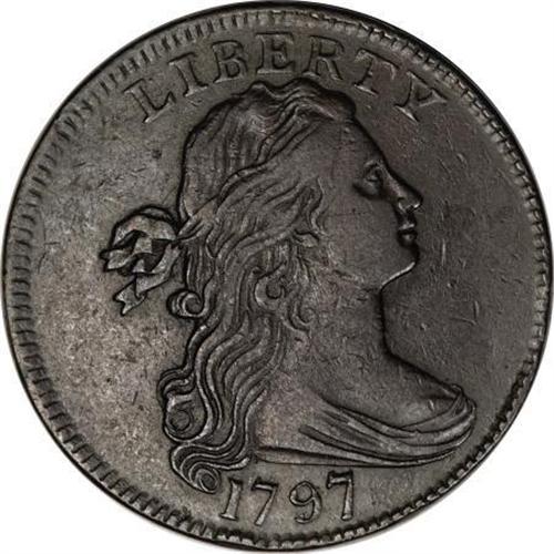 <B>1797 1C Reverse of 1797. XF40 PCGS. S-129, B-24, R.5.</B></I> <B>Bland VF20; tied for CC-3. Noyes VF20; tied for CC-3. Photo #23056. Our EAC Grade VF20.<BR><BR>Equivalents.</B></I> Proskey 17; Doughty 108; McGirk 16A; Clapp-Newcomb 12; EAC 24; <I>Encyclopedia</B></I> 1710; PCGS #1422.<BR><B><BR>Variety. </B></I>1, 7, and R all free, broken B. M corrected from E. The obverse appears on S-129, S-130, S-131, and NC-8. The reverse appears on S-128 and S-129.<BR><B><BR>Surfaces.</B></I> Light steel-brown with traces of olive color on both sides. The surfaces are smooth, with few imperfections aside from the usual minor handling marks associated with the grade.<BR><B><BR>Die State II.</B></I> The curved break that eventually develops behind the hair ribbon is only a faint outline in this die marriage. The reverse has several sets of clash marks.<BR><B><BR>Appearances. </B></I>The obverse and reverse are illustrated in Noyes (2007).<BR><B><BR>Census.</B></I> A rare variety, seldom found decent. Two examples just make the XF grade level per Bland, but grade high in the VF range per Noyes. This pleasing VF20 coin is tied with one other for third finest known. In 1949, Sheldon graded one specimen (probably the Newcomb-ANS coin) MS60, and he graded the same coin XF45 in 1958. Today, Bland grades the ANS coin XF40 and Noyes calls it VF35.<BR><B><BR>Commentary.</B></I> In <I>Early American Cents</B></I>, Sheldon described S-129 as "one of the famous and much sought rarities, since it was described and published by Proskey." When <I>Penny Whimsy</B></I> was published in 1958, it was considered Rarity-7, with just nine examples known, eight available to collectors. Today, the population is about 50 to 60 coins, almost all in lower grades.<BR><BR><B>Provenance.</B></I> <I>Flambeau Stamp & Coin Co. (1966 FPL), lot 66; C. Douglas Smith.</B></I><BR><BR><B>Personality.</B></I> <B>Flambeau Stamp & Coin Co.</B></I> is of interest to collectors for its July 1966 fixed-price catalog of early large cents. John D. Wright, in a footnote to his 1972 <I>Penny-Wise</B></I> article "A Survey of Large Cent Auctions: Part IV: Fixed-Price Offerings," suggests why Flambeau did not become prominent in the field: "Most overgraded and underpriced."<BR><BR><b>Shipping:</b> Coins & Currency (<a target="_blank" href="http://www.heritageauctions.com/common/shipping.php">view shipping information</a>)