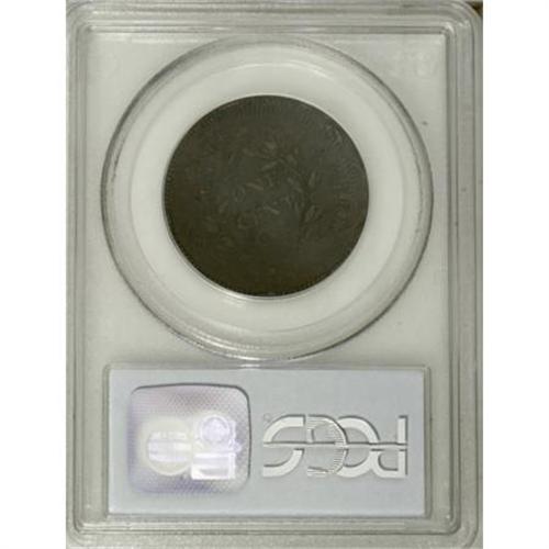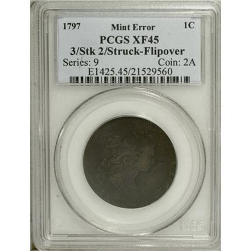 <B>1797 1C Reverse of 1797, Stems--Triple Flipover Strike--XF45 PCGS.</B></I> S-138, B-20, R.1. While double struck early date large cents are occasionally encountered, pieces that are triple struck can only be classified as extremely rare. When the triple strike includes a flipover, not only is the piece extremely rare, but it also presents a spectacular appearance. Substantial detail can be seen from all three strikes, including three completely visible dates. One is in the normal obverse position, another is intertwined with D ST on the reverse, and the third can be seen at the top of the left branch of the wreath below ATE.<BR> In addition to its remarkable appeal as a major large cent error, it is an excellent quality piece with smooth mahogany fields and lighter brown devices. This identical specimen served as the plate coin on page 844 of Walter Breen's <I>Encyclopedia of United States Large Cents</B></I> to illustrate a triple strike. EAC 30.<BR> Note: PCGS incorrectly assigned their coin number 1425 (No Stems) to this piece.<BR><BR><B>Coin Engraver:</B> Robert Scot<BR><BR><b>Shipping:</b> Coins & Currency (<a target="_blank" href="http://www.heritageauctions.com/common/shipping.php">view shipping information</a>)