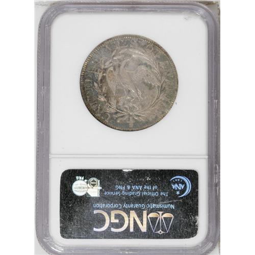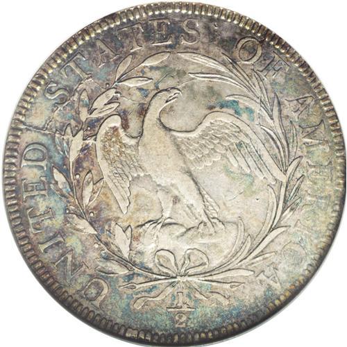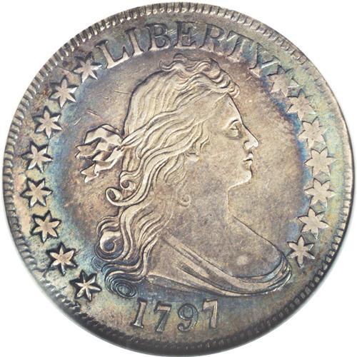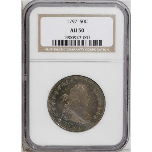<B>1797<50C> AU50 NGC.</B></I> O-101a, R.5. The appearance of any 1797 half dollar in a public auction is bound to generate great excitement. This was the second year of a two-year type, the Draped Bust Small Eagle half dollar, which may be regarded as one of the keys to a complete type collection of American coinage.<BR> The story of the 1796-1797 Draped Bust, Small Eagle half dollars is shrouded in mystery. What we know for certain is that the Philadelphia Mint produced approximately 3,918 half dollars dated 1796 and 1797, before suspension of the denomination until 1801. By the latter date, Robert Scot's Small Eagle reverse had yielded to his Heraldic Eagle design. This fact, coupled with the limited original mintage, accounts for the importance of the 1796 and 1797 half dollars as rare type coins.<BR> In an effort to reconstruct the circumstances that surround the production of these two issues, we have relied heavily upon Breen's <I>Complete Encyclopedia</B></I> (1988), although we caution readers that even the noted numismatic author himself states that his conclusions are "presented only as conjecture, as no other Archives data survive about these mintages." It appears that the Mint produced two obverse dies (one dated 1796 and the other either undated or dated 1797) with 15 stars, sometime before the admission of Tennessee as the sixteenth state on June 1, 1796. Following the latter event, a third 1796-dated obverse was produced with 16 stars. These dies were used to produced the following pieces: (60) 1796 15 Stars examples on February 28, 1797; (874) 1796 15 Stars and 1796 16 Stars examples on March 21, 1797; and (2,984) 1797 examples on May 26, 1797. The latter issue was produced using the second die that the Mint had made prior to June 1, 1796, now definitely dated 1797. All three deliveries were made to the Bank of the United States, who had deposited French silver