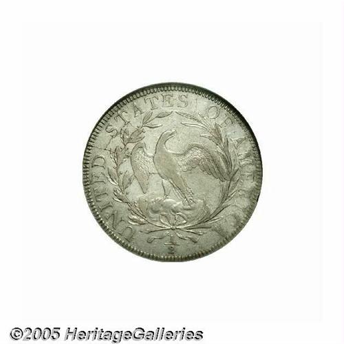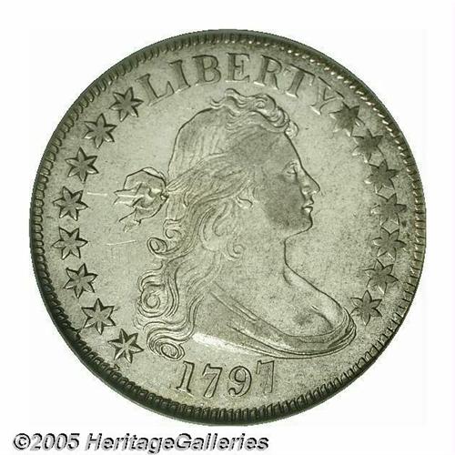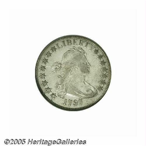 <B>1797<50C> AU55 NGC.</B></I> O-101a, R.5. Long known to be the most difficult type coin of the denomination, Draped Bust Small Eagle half dollars have enjoyed nearly legendary status and are perhaps the most avidly sought type in all of U.S. numismatics. This design was coined for only two years, 1796 to 1797, with a total mintage of 3,918 pieces. Of this miniscule production, relatively few specimens are thought to have survived. In the ten years he has been studying the history and rarity of this series, researcher Jon Amato has, to date, accounted for nearly 220 1796-97 half dollars, of which eleven are in AU grades. The interested reader is referred to the February 2005 issue of the <I>John Reich Journal</B></I> (Vol. 16/Issue 2, pp. 12-17) for more information on this research.<BR> Just four die marriages are known for the type, two for each of the dates of production. All four varieties were struck in 1797 as part of three deliveries. Mint records indicate that the first delivery was made on February 28, 1797 (60 coins), the second delivery on March 21 (874 coins), and the last on May 26 (2,984 coins). All of these coins were minted from silver ingots deposited by the Bank of the United States, and all of the deliveries were made to the Bank.<BR> The high-grade 1797-dated specimen offered in this lot is an advanced die state of the Overton 101 variety (O-101a). It is characterized by its reverse, which consists of myriad die cracks. The obverse is perfect aside from a heavy crack from the rim through the second star to a lower curl. Liberty's cheek and shoulder have light wear, as does the eagle's breast, but most of the wings and hair curls retain considerable bright luster. This silvery piece is essentially unmarked aside from a pair of inconspicuous pinscratches near the hair ribbon, and there are no visible adjustment marks. A few wispy slide marks in the fields are mentioned for accuracy. The design elements are well centered on the planchet, and the dentilation is fairly strong on both sides. For the advanced collector, the importance of this Choice AU early silver type coin cannot be overstated.<BR><I>From The Melrose Bay Collection.</B></I>