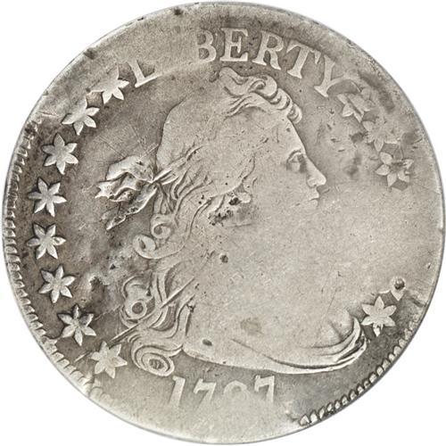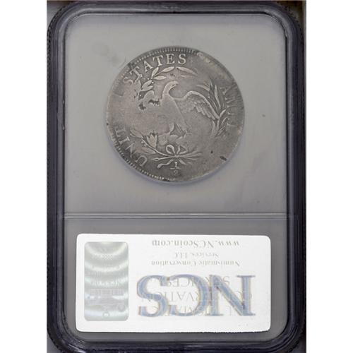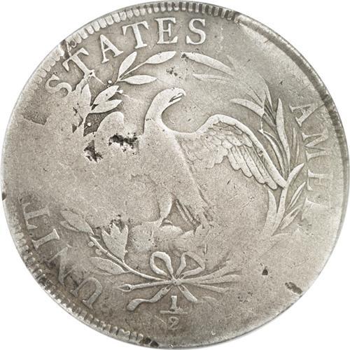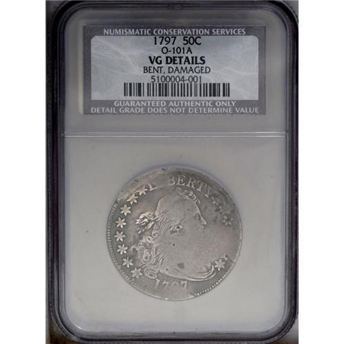 <B>1797<50C>--Bent, Damaged--NCS. VG Details.</B></I> O-101a, High R.4. The Draped Bust Small Eagle half dollar, bearing the dates 1796 and 1797, is comprised of four varieties. The 1796 with 15 stars is Overton 101, and that with 16 stars is Overton 102. A 1797 obverse die was paired with the reverse used on the 1796 issues, and is designated Overton 101. Over time, this reverse developed myriad die cracks (Overton 101a). A new reverse die, identified by slight differences in the alignment of the wreath relative to the peripheral lettering, was then paired with the 1797 obverse (Overton 102).<BR> The Overton 101a example in this lot displays the typically-seen die cracks (including the obverse crack that travels from the rim through star 2 to Liberty's curl), except where they are worn away. The crack connecting the bottoms of ST in STATES, another extending from the lower upright of the first T through a leaf to the eagle's neck, and one traveling from the rim just right of the last S in STATES to two leaves below, are all visible. Both sides display semi-bright silver-gray surfaces that show slighter darker color in some of the protected areas. Uneven wear results from the coin having been slightly bent. Actually, the design elements exhibit fairly strong detail on Liberty's upper facial features, on the flowing ribbon and hair curls beneath, on the 17_7 of the date, on the stars along the left border, and on the ERTY of LIBERTY. On the reverse, most of the eagle shows, except for its right (left facing) wing, as does the bowknot and fraction below, and the letters UNIT, all of STATES, and the letters AME. A few small punches are scattered about, especially on the obverse, and a noticeable scratch extends from the rim above star 1 through the lower curls. A few thin, relatively unobtrusive pinscratches are also noted on each side.<BR> That this piece of Americana has its share of problems is undeniable. Regardless, 1796-1797 halves in all grades, and with or without <BR><BR><B>Important notice:</B> Heritage usually auctions material at the rate of 200-250 lots per hour. On some occasions eBay Live bid software or the Internet may not be able to keep up with the pace of the auction. We recommend placing a realistic absentee bid now as insurance to avoid disappointment. Occasionally the auctioneer may eliminate or reject an eBay Live bid, and the auctioneer may also reopen a lot after the close of the eBay live bidding (usually because we missed an audience bid), and may reject your bid even if it shows you as the winning bidder. By bidding via eBay Live, you agree that Heritage may award the lot to another bidder at its sole discretion under the circumstances described above or any other reasonable circumstances. Since eBay bids are not shown to us until we open the lot on the floor, we treat those bids just like floor bids. In most cases the floor responds before the eBay bid is presented to us, due to Internet lag time, so for consistency we have made it a policy that floor bids are always considered first over tie eBay live bids. Also please note that all Heritage lots purchased through eBay Live carry a 20% Buyer's Premium. Please make sure you read the Terms and Conditions before you bid. This lot is being auctioned in conjunction with a live floor auction by Heritage Galleries & Auctioneers. All final auction and invoice information will be supplied by Heritage Galleries & Auctioneers, and all other information should be considered preliminary. Lot:1924 <BR><BR><B>Winning Notification and Billing:</B> After the FINAL session in this auction is complete, Heritage will send e-mail and snail mail invoices. This process normally takes several days. All final auction and invoice information will be supplied by Heritage Galleries & Auctioneers, and all other information should be considered preliminary. <BR><BR>This auction will be conducted on a live auction floor and over the Internet through eBay Live. If you choose to place an absentee bid, please take a moment to <font color='#0000ff'><u><a href='http://pages.ebay.com/liveauctions/help/before/laabsentee.html'>learn how eBay Live absentee bidding works</a></u></font><font color='#000000'>