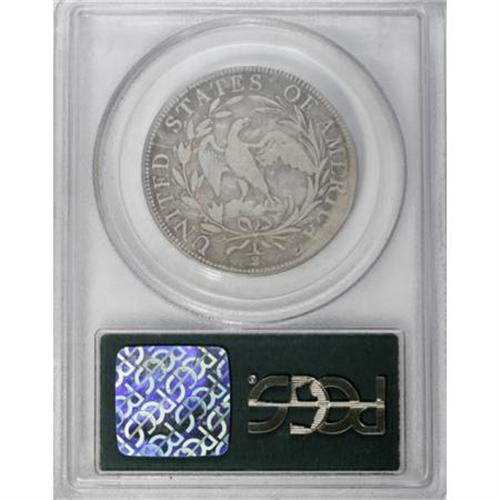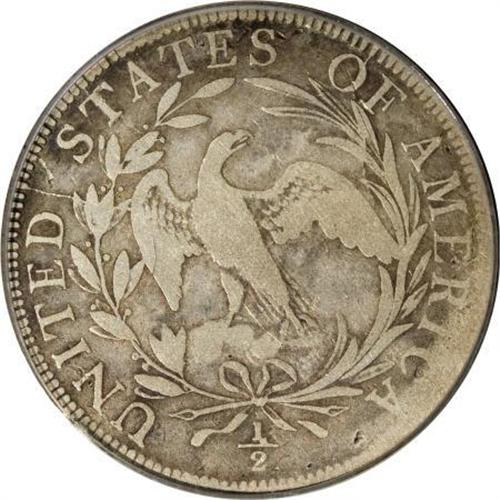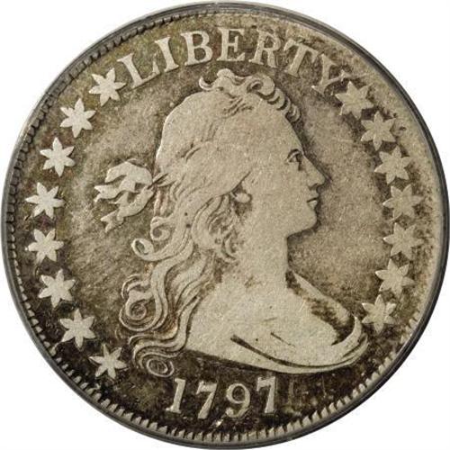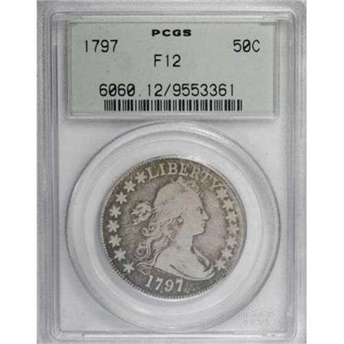 <B>1797 50C Fine 12 PCGS.</B></I> O-101a, High R.4. Presented in this lot is perhaps the most important and desirable type coin in American numismatics, the 1796-1797 Draped Bust Small Eagle half dollar (from a mintage of 3,918 pieces). This is not the rarest of United States type coins--that honor goes to the one-year types 1796 No Stars and the 1808 quarter eagles, with mintages of 963 and 2,710 pieces respectively. The Small Eagle half, however, has the greatest collector demand, which is reflected in it having the highest price, grade for grade, of <I>any</B></I> U.S. type coin. <BR> This Fine 12 example displays silvery design elements highlighted by medium gray-tan fields, accented with whispers of green and red at the obverse margins. Liberty's hair is well defined for the grade designation. Indeed, all elements are quite sharp, except for the tops of the letters RICA in AMERICA that are merged with the rim. The surfaces on both sides are relatively clean for a coin that has seen moderate circulation. Minute marks below and left of the date, and another between the D of UNITED and the S of STATES are mentioned solely for identification purposes. There are no adjustment marks visible. This specimen exhibits a faint incipient crack from star 2 to the second curl, another from the rim at 9 o'clock through the leaves to the wing, and another from the first T in STATES to the neck, indicative of the early state of O-101a. Housed in a green-label holder. All in all, this is a problem-free coin that is very pleasing for the grade. As such, it will serve as the cornerstone to a U.S. type collection or a date/variety collection of Bust halves.<BR><I>From The Casa Becca del Norté Collection.</B></I><BR><BR><B>Coin Engraver:</B> Robert Scot<BR><BR><b>Shipping:</b> Coins & Currency (<a target="_blank" href="http://www.heritageauctions.com/common/shipping.php">view shipping information</a>)