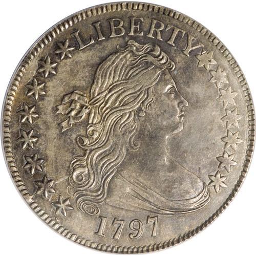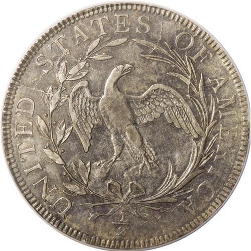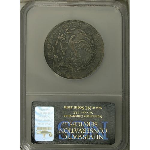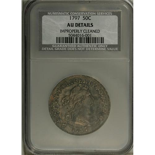 <B>1797 50C --Improperly Cleaned--NCS. AU Details.</B></I> O-101a, High R.4. The appearance of a 1796-1797 Draped Bust Small Eagle half dollar at auction, even those that display impairments, is always the cause of excitement. This is because its two-year-type status makes it necessary for the completion of a type set of United States coinage. Early half dollar specialists attempting to assemble a date and/or variety collection place additional demand on this series. High demand and a paltry mintage of 3,918 pieces, followed by a relatively low survival rate, have all combined to maintain a relatively high value for 1796-1797 half dollars since the dawn of American coin collecting in the 1850s. Published estimates of the number of extant pieces range from about 100 to 300 examples, though recent empirical research has accounted, to date, for about 225 or so coins.<BR><BR> Four varieties of Draped Bust Small Eagle half dollars are known. The first 1796 variety (Overton 101) consists of 15 obverse stars. The star number on 1796-dated coins was eventually increased to 16 (Overton-102), apparently to commemorate Tennessee's June 21, 1796 admission to the Union as the 16th state. The two 1797 varieties (Overton-101 and Overton-102), each bearing 15 obverse stars, are differentiated by slight differences in the reverse wreath alignment vis-a-vis the peripheral lettering. The 1797 Overton-101 variety eventually developed extensive spindly die cracks on the reverse, resulting in an Overton-101a die state.<BR><BR> The 1797 AU Details specimen offered in this lot is Overton-101a. Fine hairlines on both sides are well concealed within the bluish-gray toning that is accented by occasional blushes of orange-gold and magenta, particularly on the obverse. The design elements exhibit sharp detail, and are nicely centered on the planchet. A few light obverse adjustment marks are visible. Each side reveals a mark or two that may aid in the pedigree of this coin, especially two light abrasions on the outer portions of star 9. All in all, this is a pleasant example of this much coveted design type.<BR><BR><b>Shipping:</b> Coin/Currency (<a target="_blank" href="http://www.heritageauctions.com/common/shipping.php">view shipping information</a>)