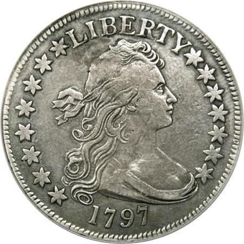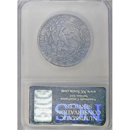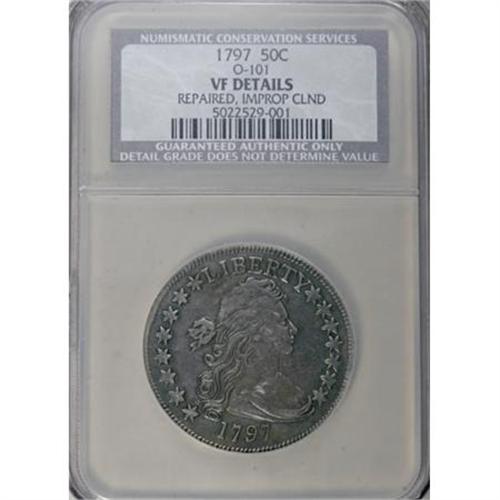 <B>1797 50C --Repaired, Improperly Cleaned--NCS. VF Details</B></I> O-101, High R.4. The 1797 half dollar offered in this lot presents an extremely important opportunity for the type collector or the early half dollar date and/or variety specialist. The Draped Bust Small Eagle half dollar design type bears the date 1796 or 1797, though both issues were struck in the first half of 1797. A total of four varieties are known for the two years. From these four die pairs, a total of 3,918 coins were produced.<BR> The O-101 would appear to be the most "common" of the four varieties, as its High R.4 rarity rating compares with R.5 for the 1796 O-101 (15 stars), High R.5 for the 1796 O-102 (16 stars), and Low R.6 for the 1797 O-102 variety. We would note, however, that the 1797 reverse die evidently cracked quite early, resulting in the vast majority of 1797 O-101 coins having myriad reverse die cracks, this later die state designated O-101a. Conversely, research being conducted on the Draped Bust Small Eagle half dollars series by this cataloger (Jon Amato) shows far fewer O-101 early die state pieces apparently having been struck, and consequently a relatively small number are seen today.<BR> This coin is not displeasing to the unaided eye. As expected, however, magnification brings out the imperfections indicated on the NCS holder. These include fine hairlines, and extensive tooling in the fields resulting in some surface roughness. On the plus side, the design elements exhibit sharp VF detail, and the dentilation is quite strong, save for a tooled area in the lower right reverse quadrant. The semibright surfaces are beginning to retone deep blue in some of the recesses and grayish-tan in the fields. There are no deep scratches or serious rim damage, and adjustment marks are absent. In summary, a comparatively respectable coin despite its flaws, which plague a large number of the representatives of this most difficult U.S. design type.<BR><BR><B>Coin Engraver:</B> Robert Scot<BR><BR><b>Shipping:</b> Coins & Currency (<a target="_blank" href="http://www.heritageauctions.com/common/shipping.php">view shipping information</a>)