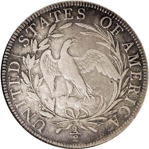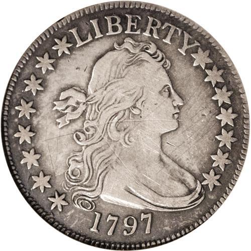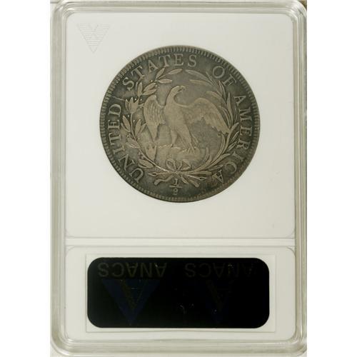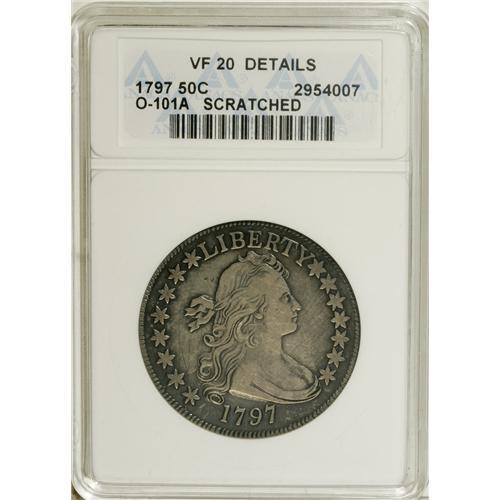 <B>1797 50C --Scratched--ANACS. VF20 Details.</B></I> O-101a, High R.4. The 1797 half dollar, along with its 1796-dated cousin, is one of the most important U.S. type coins. This two-year design type displays the draped bust of Liberty on the obverse and a small eagle on the reverse. Its mintage (which was not broken down by 1796 and 1797) was a paltry 3,918 pieces, and it is generally believed that fewer than 300 specimens have survived the ravages of time. Many of them have been mishandled, and exhibit plugs, scratches, rim bruises, graffiti, tooling, scrapes, harsh cleaning, or various other impairments. Yet, even the "problem" coins are in high demand, demonstrating the true rarity of the series.<BR> Al Overton, in his <I>Early Half Dollar Die Varieties,</B></I> recognizes four varieties of the Draped Bust Small Eagle half dollar. The 1796 issue consists of a 15-star obverse (Overton-101) and a 16-star obverse (Overton-102), while the two 1797 varieties (both with 15 obverse stars) are distinguished by a slight variation in the positioning of the reverse wreath relative to the peripheral lettering (Overton-101 and Overton-102). The 1797 O-101 has an advanced die state (O-101a) in which the reverse displays numerous cracks, as well as an obverse crack from the rim through star 2 to Liberty's curl.<BR> The 1797 VF20 Details example for sale in the current lot is O-101a. Light gray toning in the centers yields to darker gray at the margins, where it is joined by sky-blue accents, especially on the obverse. The same sky-blue color is embedded within some of the recesses of the Liberty motif. The dentilation is strong on both sides, and relatively sharp definition is apparent on the remaining design elements, including most of Liberty's hair, and the eagle's tail and internal parts of the wings. Adjustment marks are absent from both sides, but several shallow scratches are visible on the obverse, and somewhat less so on the reverse. Aside from these, this is a fairly nice piece with good color and detail, and as such, is worthy of serious consideration by collectors seeking to complete a type set or half dollar date/variety collection.<BR><I>From The Hoosier Discovery Collection.</B></I><BR><BR><b>Shipping:</b> Coins & Currency (<a target="_blank" href="http://www.heritageauctions.com/common/shipping.php">view shipping information</a>)