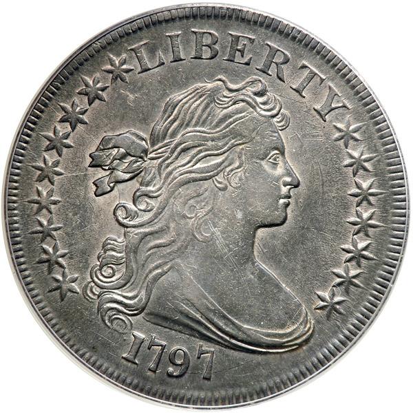 1797 B-1, BB-73 Draped Bust 9X7 Stars Large Letters Rarity 3. PCGS graded AU-55. Subset of PCGS # 6863. In a new secure plus holder. Condition Census. Previously graded AU58 by NGC. There are some interesting varieties of the 1797 dollar, mostly revolving around the number of stars on the obverse (either 9X7 or 10X6). All dies have 16 stars, proving that the dies (unlike the 1798 obverse with 15 stars) were made after June 1, 1796 when Tennessee became the sixteenth state to be admitted to the Union. It may be that as few as 2,493 dollars of 1797 actually bore that date; this is the coinage executed in August, when the last silver coins for the year were delivered.