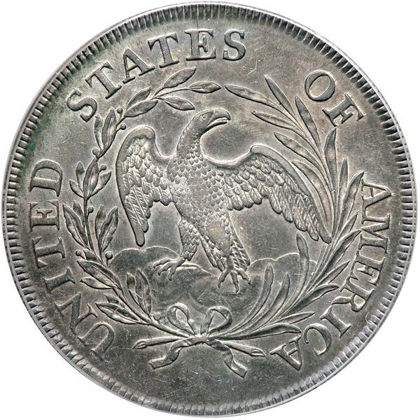 Full sharp devices and residual luster remains on antique gray surfaces, overtoned in light dappled tones. Nicely centered with a solid ring of dentils around both sides, a fabulous strike for the variety. Excellent eye appeal for the grade, a very pleasant looking coin. It is the first listed "Notable Specimen" for the variety in the Bowers' Encyclopedia. This piece is a 1797 dollar of impeccable quality and timeless appeal Pop 4; 1 finer in 58 for the variety (PCGS # 40003) .