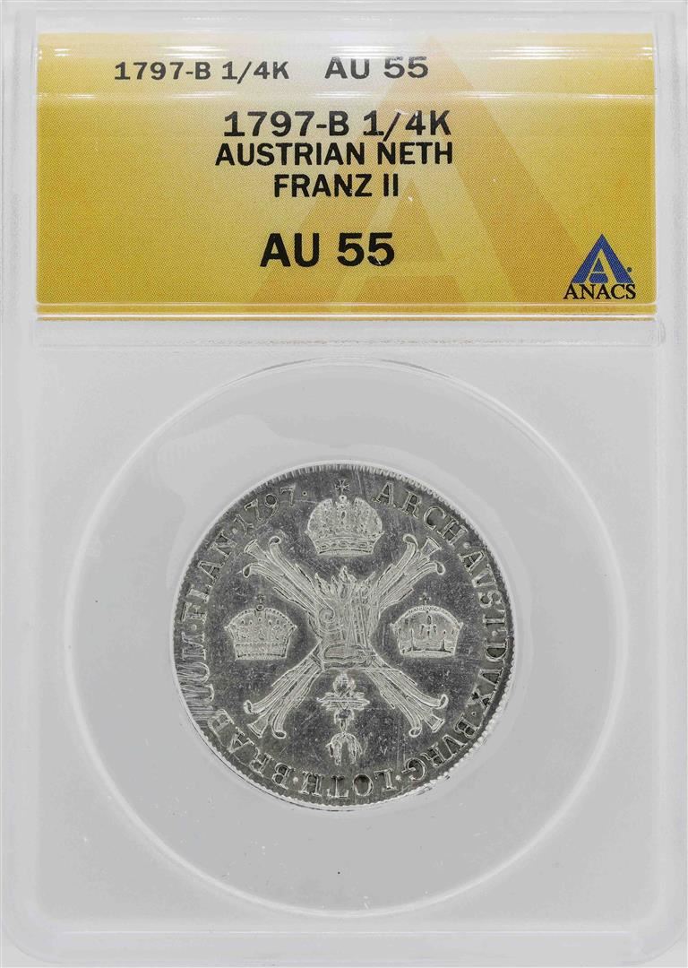 One 1797-B Austrian Netherlands 1/4 Kronenthaler ANACS AU55. ANACS Certified.